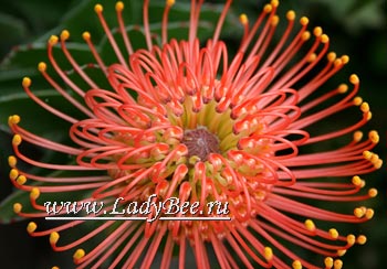 Род Леукоспермум (Leucospermum) составляют 46 видов вечнозеленых нежных растений, чаще всего с очередными цельными листьями и маленькими густыми цветками, собранными в соцветия на длинных цветоносах. Виды заметно различаются по размерам и окраске цветков.