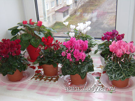 Полив цикламена (Cyclamen): Чтобы избежать загнивания клубня из-за чрезмерного полива, почву увлажняют следующим образом: погружают горшок на 2-3 см выше дна в воду на несколько часов. По окончании периода цветения поливают реже, а при появлении новых листьев (возобновление вегетационного периода растения) начинают частый полив, постоянно обеспечивая прохладную и проветриваемую среду. Цикламены рекомендуется периодически подкармливать - в воду для полива добавлять удобрение.