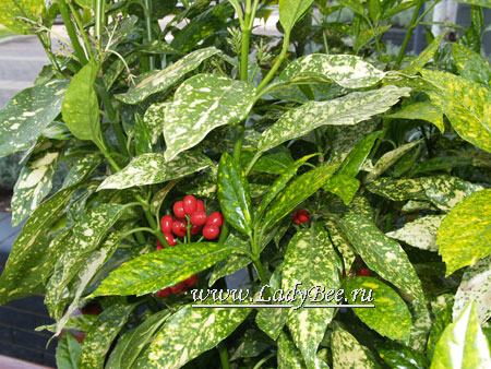 Род Аукуба (Aucuba) состоит из небольших вечнозеленых деревьев и кустарников, включает 3 вида, которые широко известны своей декоративностью. Самый распространенный из них – аукуба японская, или золотое дерево – ветвистый кустарник высотой до 3-4 м с супротивными кожистыми глянцевыми листьями овальной формы темно-зеленого цвета. Повсюду используются пестролистные декоративные формы того вида. Оливково-зеленые цветки собраны в верхушечные соцветия. Зимой на их месте образуются пунцово-красные, очень декоративные плоды – эллипсовидные с одним семенем ягоды, появляющиеся только на женских растениях (это двудомный вид, то есть растения делятся на женские и мужские). Существуют декоративные формы с листьями, покрытыми желтыми пятнами или поперечными полосками.