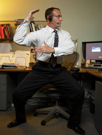 Натолкнула меня на идею о возможности заниматься фитнесом прямо на рабочем месте коллега. Она несколько раз в неделю ходит на занятия танцами, и как-то прикола ради решила устроить для нашего небольшого отдела "физкультминутку". Мы вчетвером послушно выстроились перед добровольной "наставницей", взяли по стулу и... обнаружили, что в нашем маленьком кабинетике негде нагнуться, не столкнувшись с соседом, не то, что ногой махнуть. К тому же форма одежды - довольно разнокалиберная - не позволяла делать упражнения с необходимой амплитудой и синхронностью. Да и "лежачие" упражнения, которых в ее комплексе было немало, тоже остались за гранью наших кабинетных возможностей.